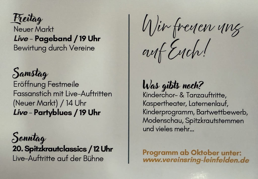 Ob Musik, gutes Essen oder einfach geselliges Beisammensein – das Krautfest Leinfelden 2025 bietet für jeden etwas. Kommt vorbei und feiert mit! 🎉