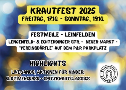 Freut euch auf drei Tage voller Musik, Genuss und Tradition! Das beliebte Krautfest Leinfelden lädt vom Freitag, 17. bis Sonntag, 19. Oktober 2025 wieder zum Feiern, Schlemmen und Mitmachen ein.