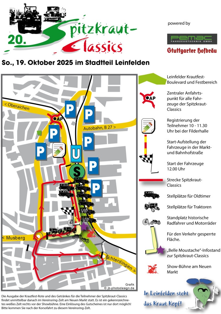 Die Fahrzeuge sind im Bereich des Neuen Marktes und der Bahnhofstraße mehrfach zu sehen. Im Anschluss daran können die Fahrzeuge an mehreren Plätzen der Krautfest-Meile bewundert werden. Falls Sie selbst mit einem alten Fahrzeug teilnehmen möchten, würden wir uns sehr freuen. Bitte füllen Sie dazu das Anmeldeformular aus.